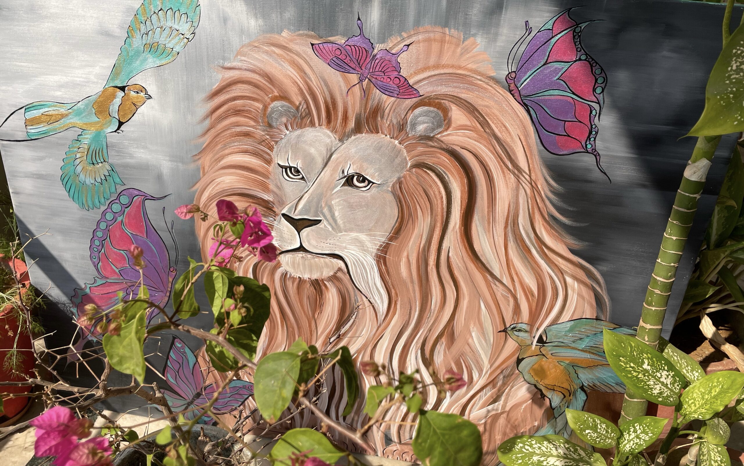 This painting is called ‘Leisure’ because when the lion became older, he seemed like a calm and relaxed one. It started looking like a beautiful flower, and the birds around it became fearless, instantly starting to revolve around it, even the lion enjoying their company.