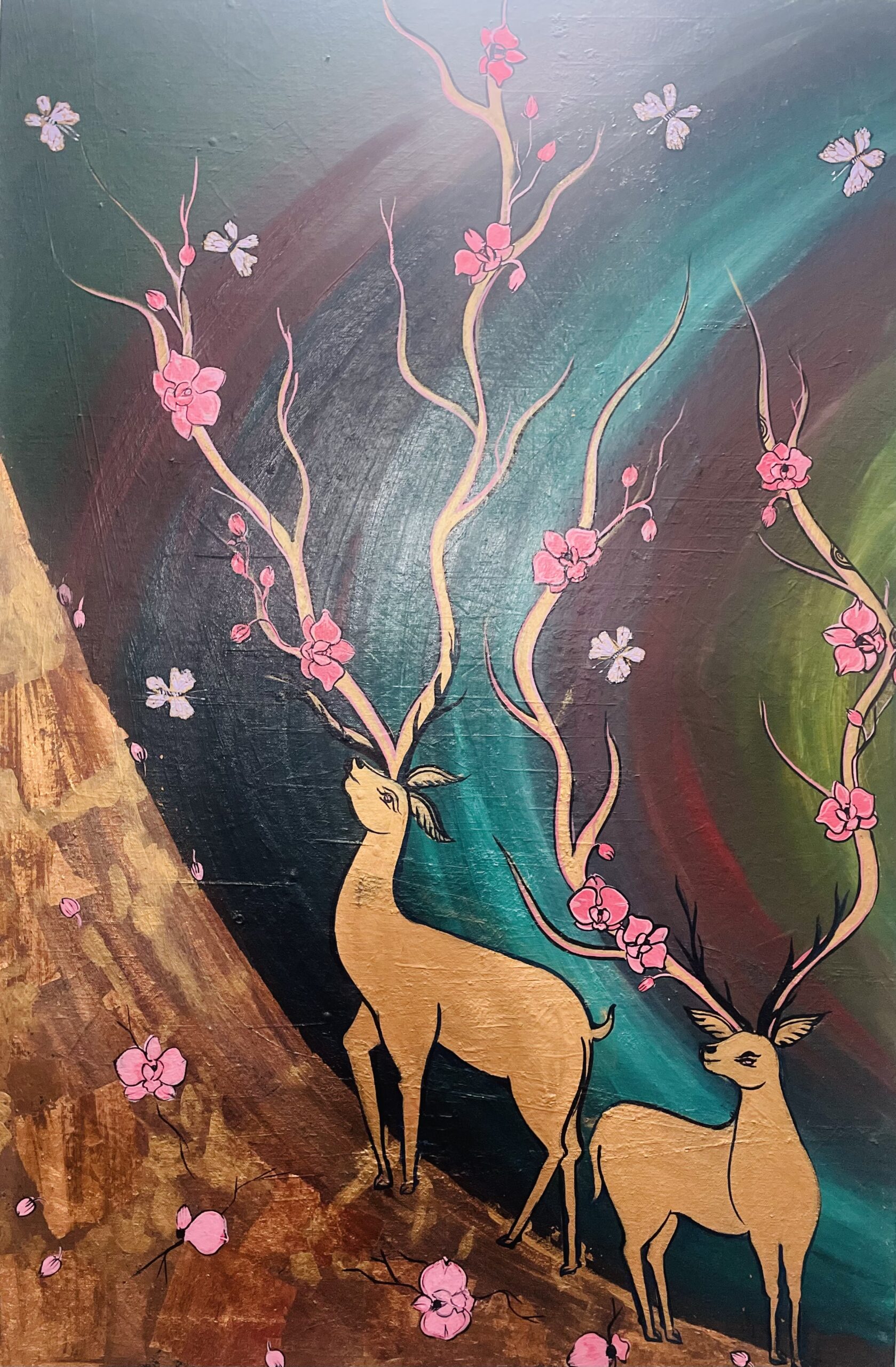 Twin Deer is a painting reflecting a relationship which can exist in any environment if they are together and due to their strong bond, they show unique Orchids and beautiful butterflies . They also wish to be with them who go though difficulties to reach their own beauty . Sometimes it’s difficult to survive , but once the phases are over you will just bloom for sure .